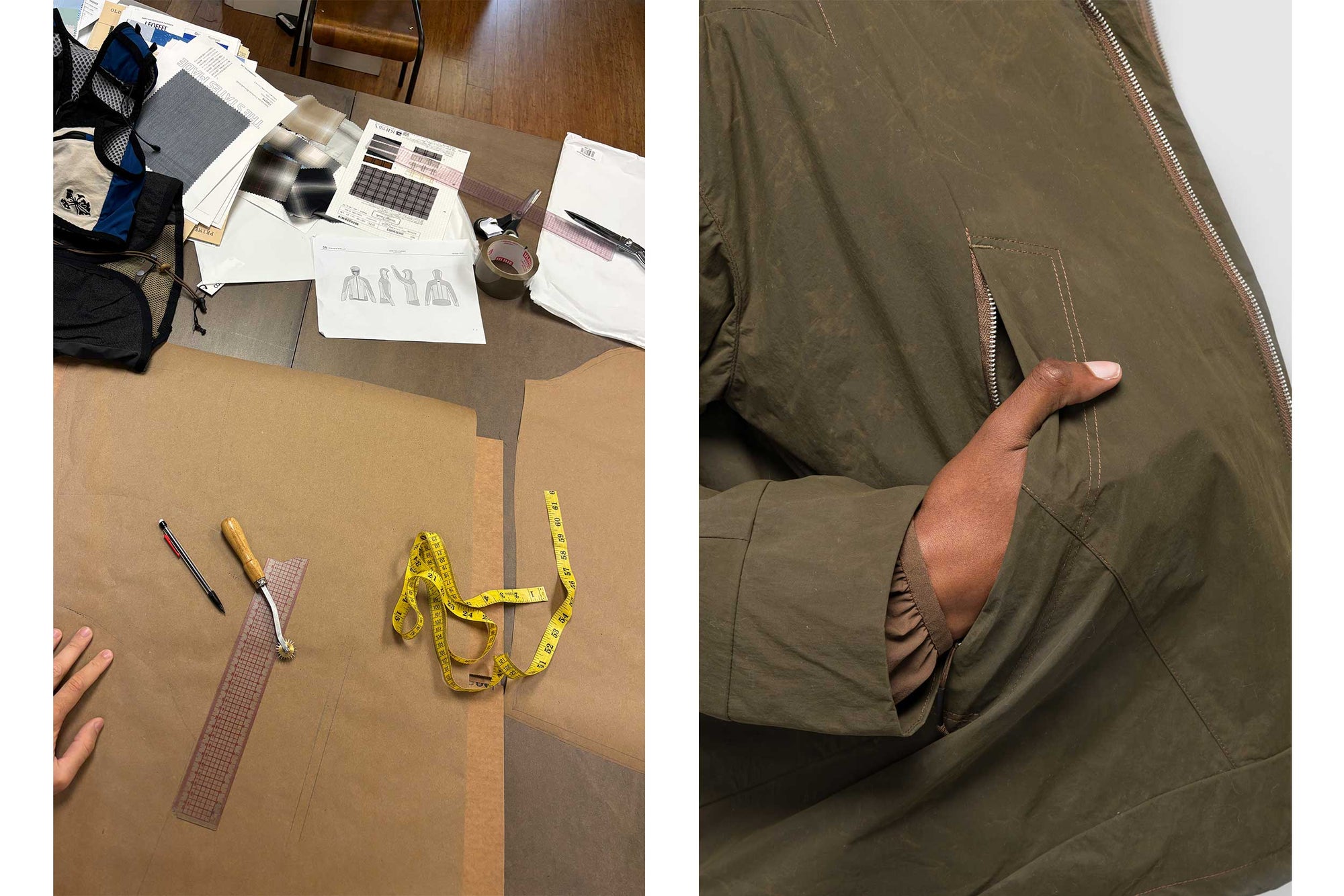 The silhouette is a classic zip up jacket, but I included modern organic pattern lines. The material reads as vintage wax-cotton—like something you’d find on a Barbour— but it’s a nylon base, making it lightweight. It also has gaskets at the cuff which function as a weather-seal for wind and rain, while retaining a formal look.