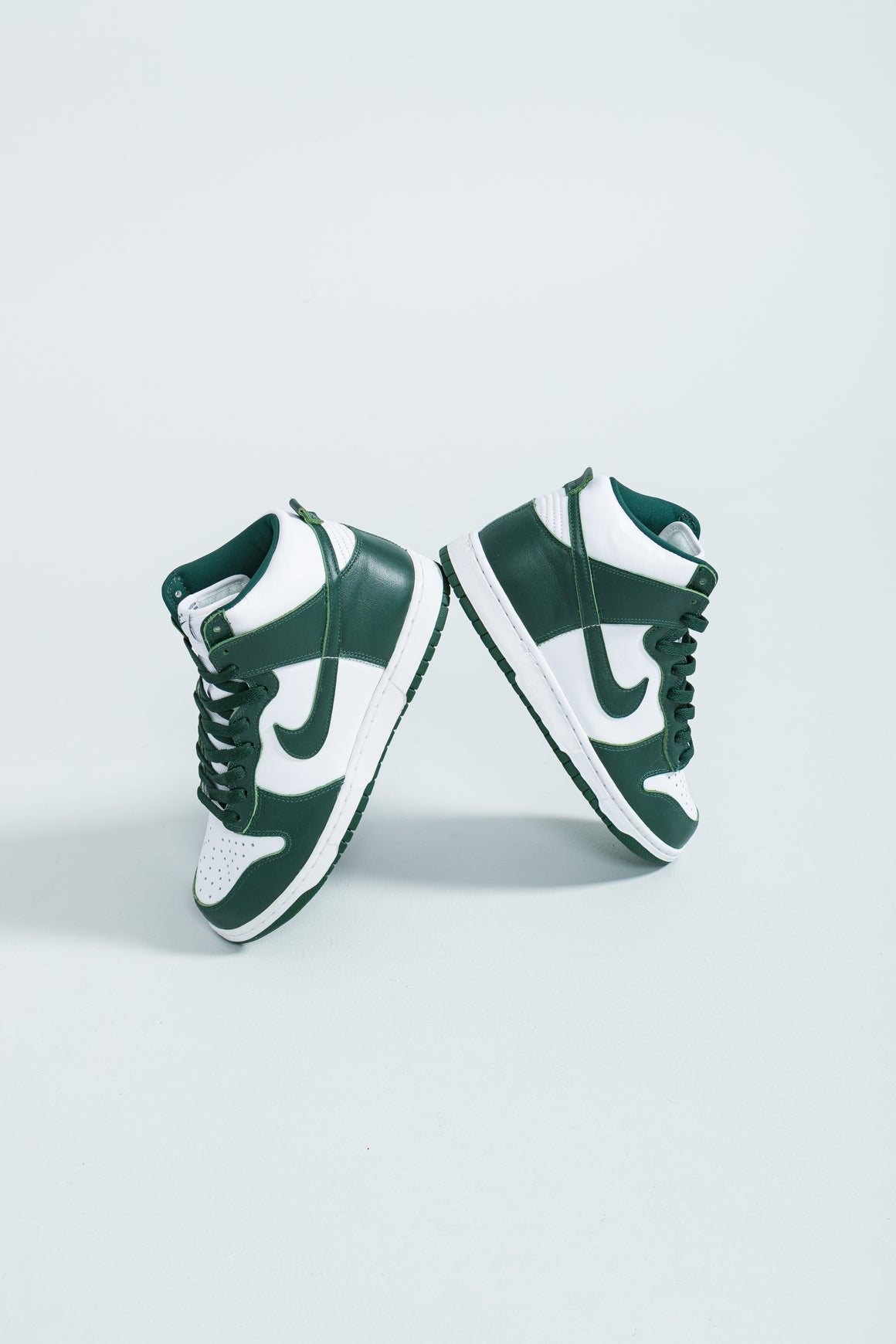 Bringing the dark ‘Pro Green’ panels together with crisp white accents, this latest colour way of the Dunk Hi blends premium leathers together with classic nylon tongue. The duo of colours continues down to the same white midsoles and matching Pro Green outersole.