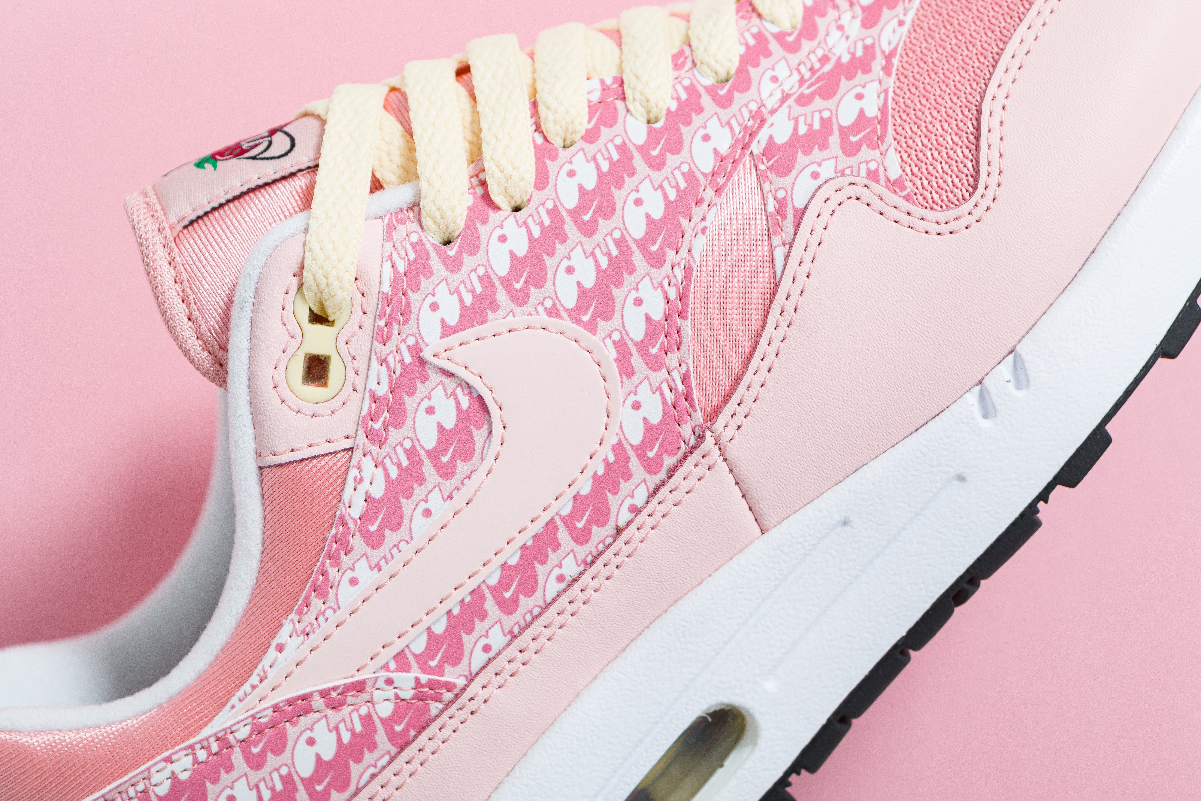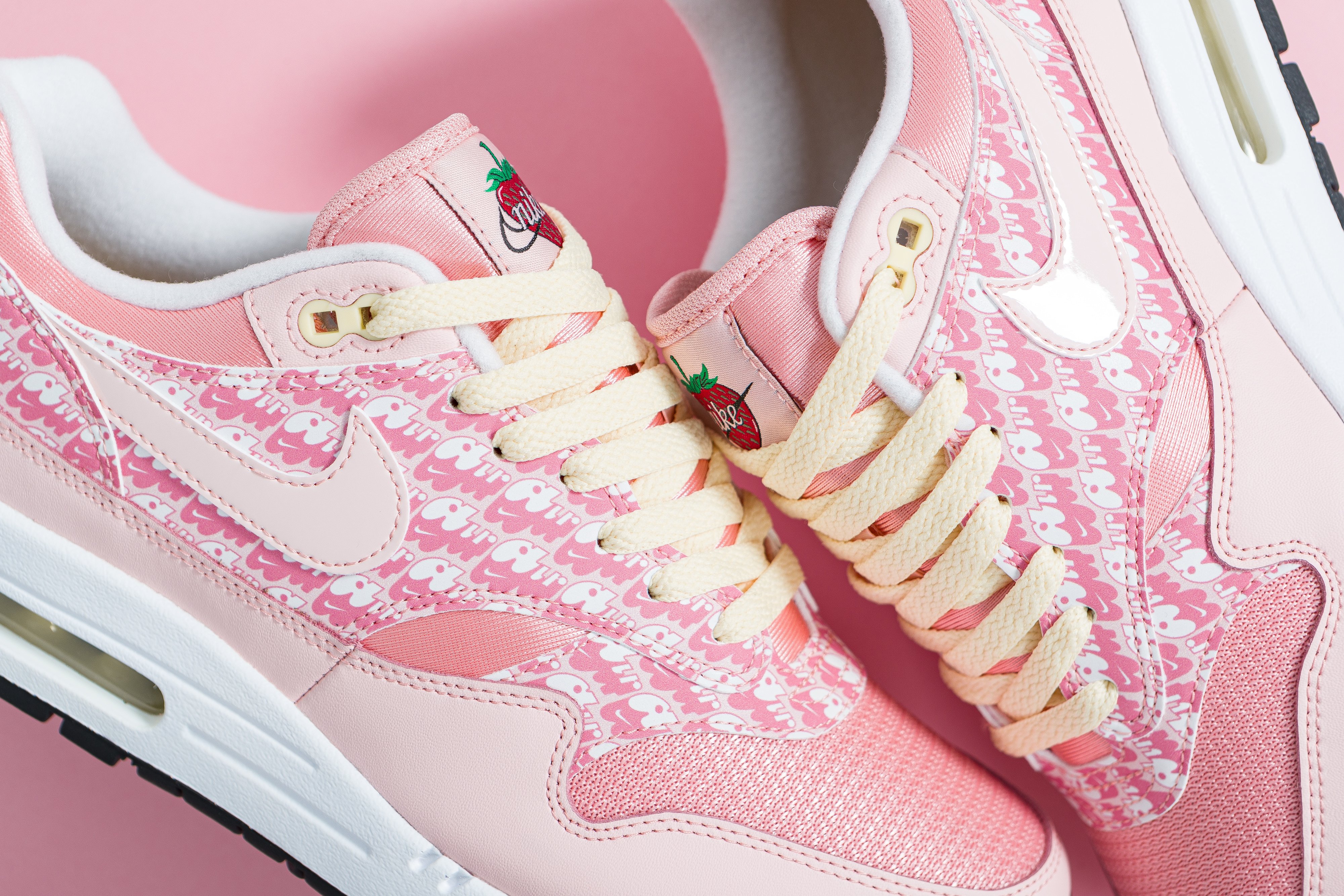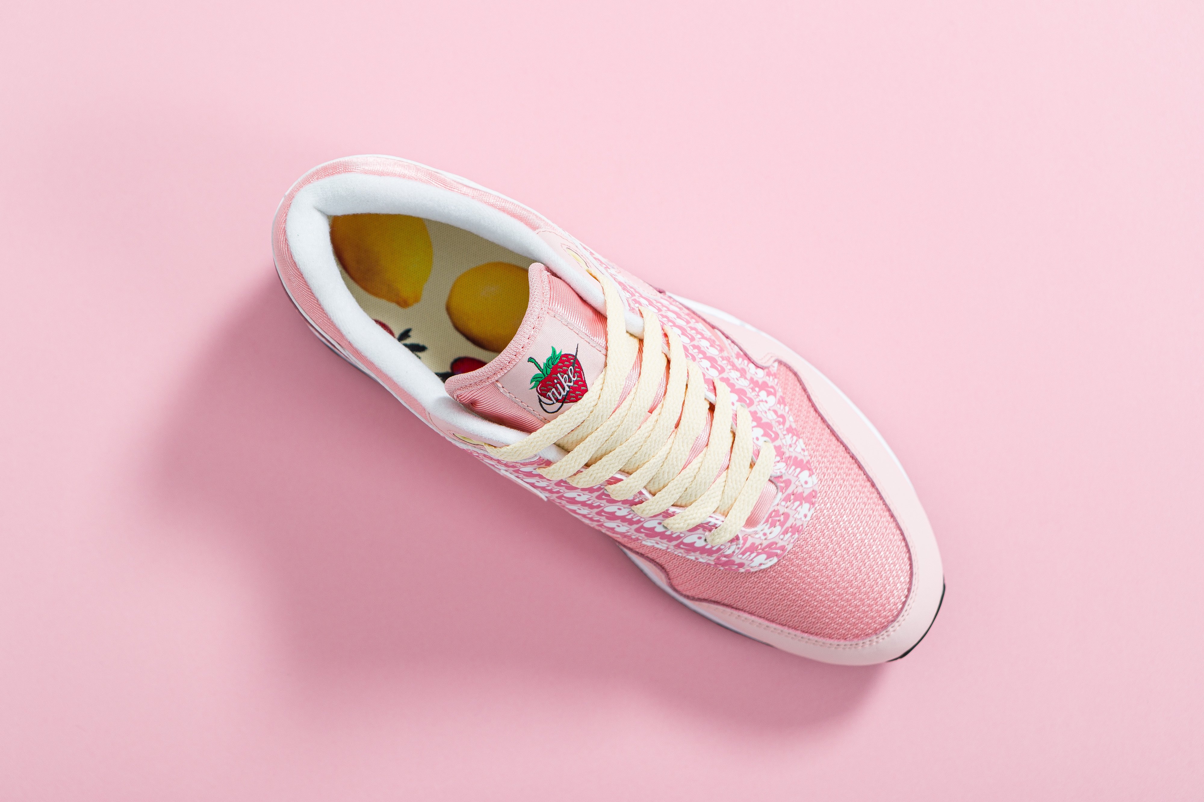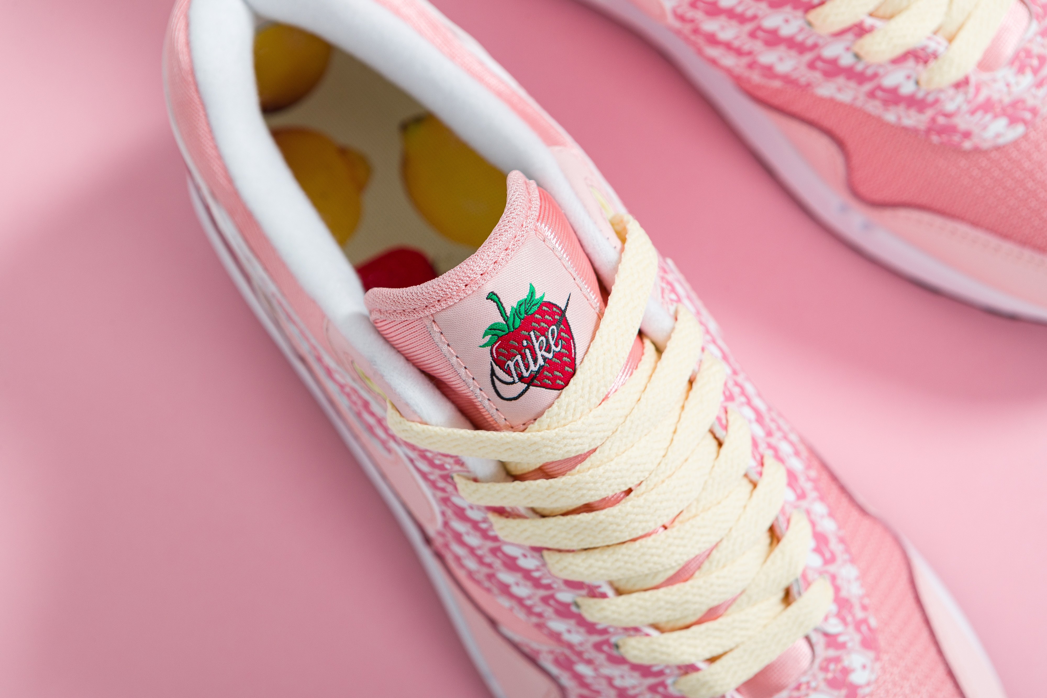 Carrying on the theme from the 2006 Powerwall AM1, we are releasing Nike's Air Max 1 Premium 'Strawberry Lemonade.' The shoe features a mesh and leather overlay in Atmosphere Pink, with the classic 'Air' pattern with a reflective finish wrapped around the shoe. Rounding out the design is a strawberry and lemon design printed on the insole, premium white midsole with yellow encapsulated Air Unit, and a contrasting black outer sole.