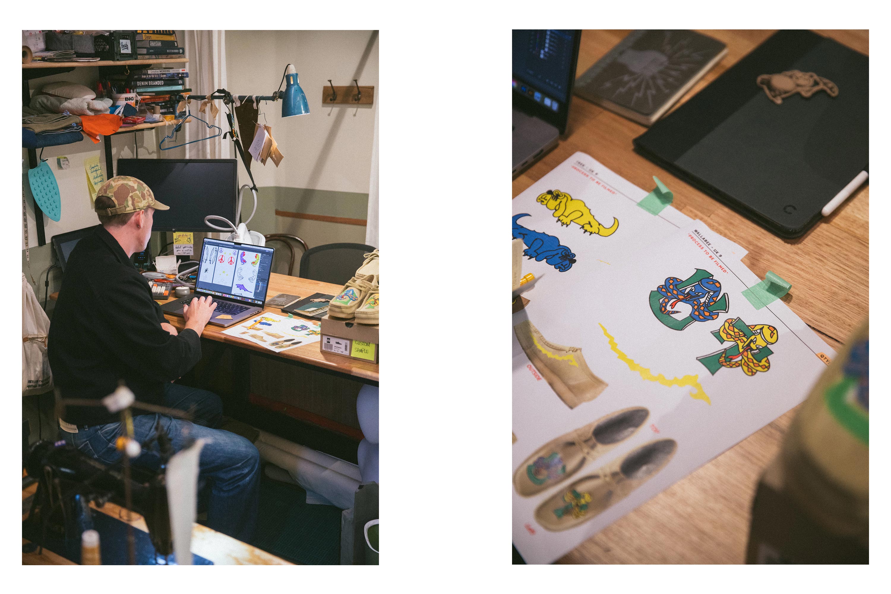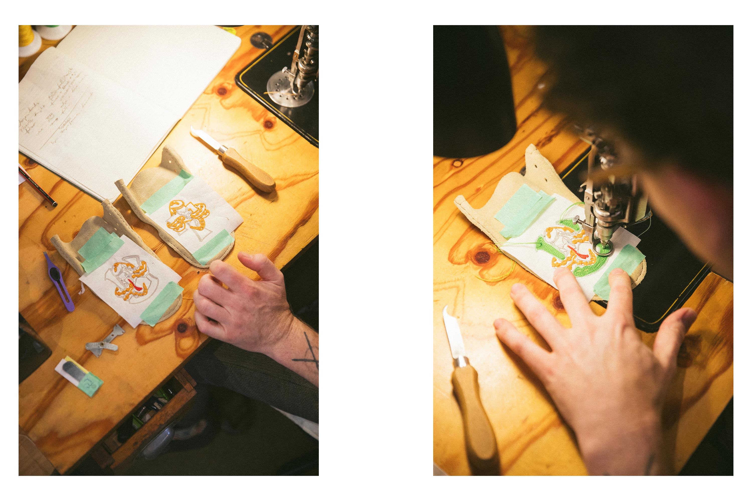 To transpose the artwork onto Clark's footwear, we employed the talents of craftsman Anthony Wicks of Anthill Workshop. Anthony works on vintage chainstitching machines to create tactile, intricate portrayals of Mike's imagery. Through a painstaking process, Anthony 'draws' each image by hand with stitches instead of brushstrokes. The final product is inimitable in its finish—rich in texture and filled with character.