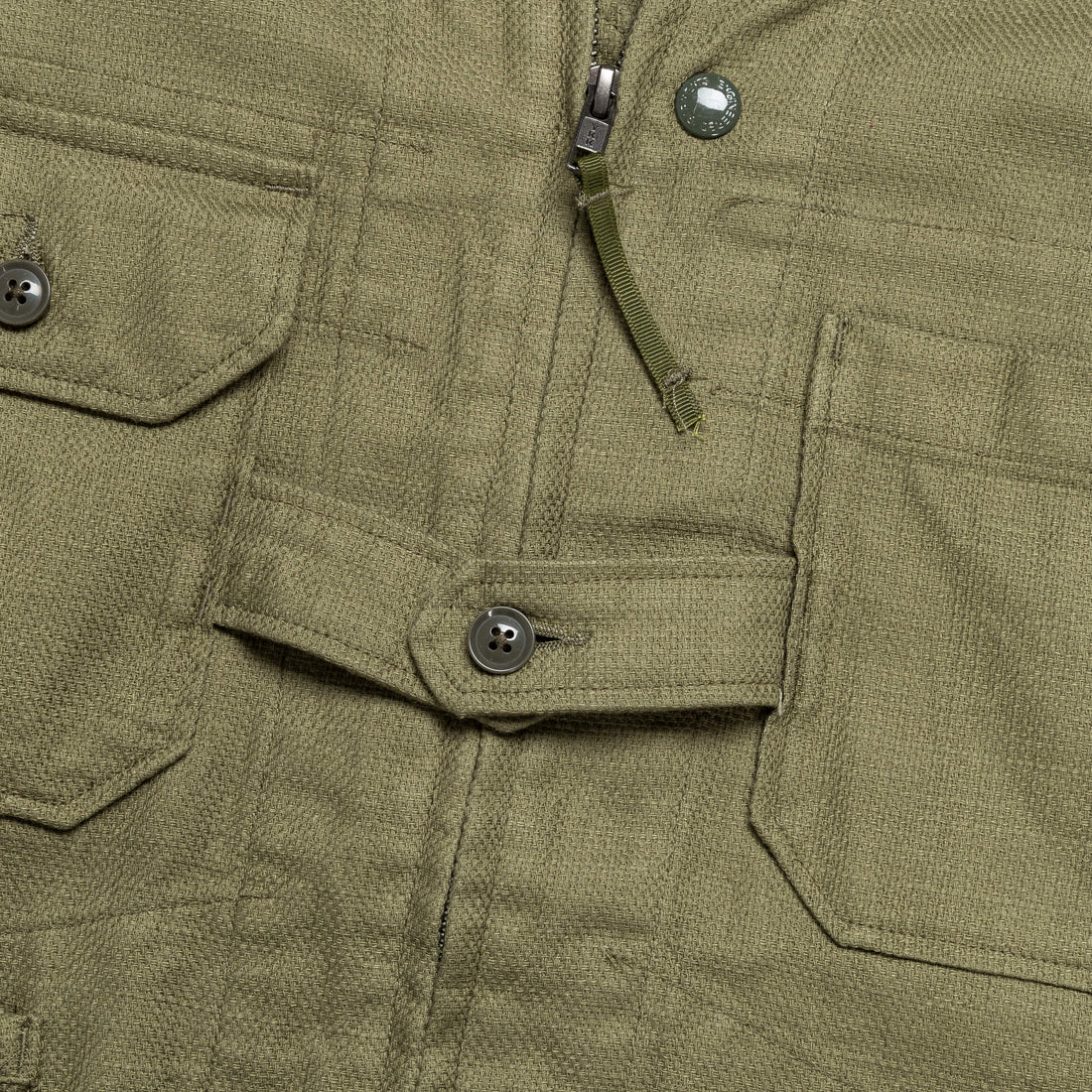 The body features four patch pockets – allowing for plenty of carrying ability – along with a binocular strap. The latter is an essential feature from a bygone era, appreciated by explorers the world-over. Daiki removed the collar, giving the jacket a cardigan-like appearance and allowing it to be more versatile – wear it over or under a layer. The fabric is classic explorer, a cotton rip-stop that likely outlast us all.