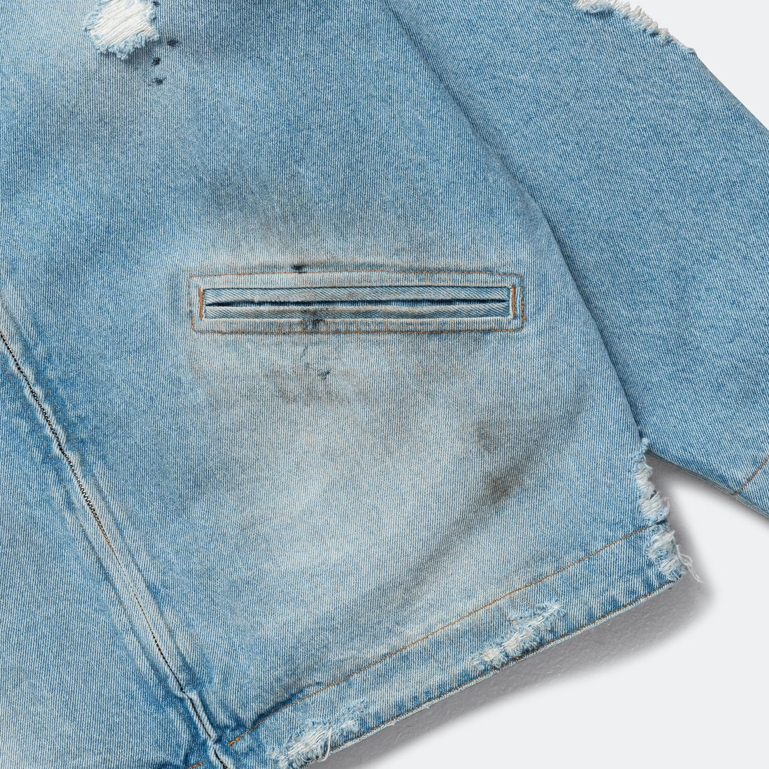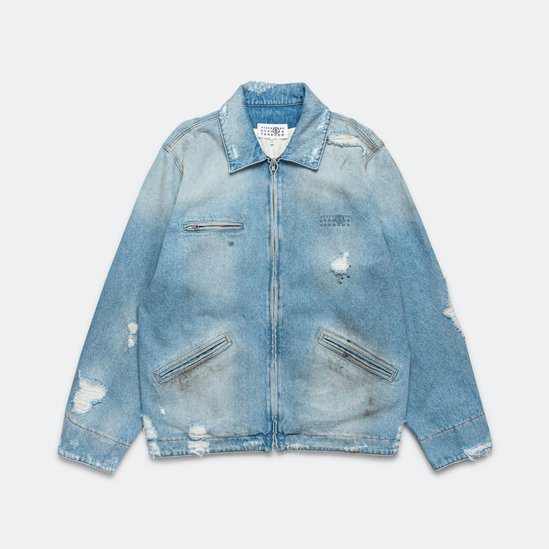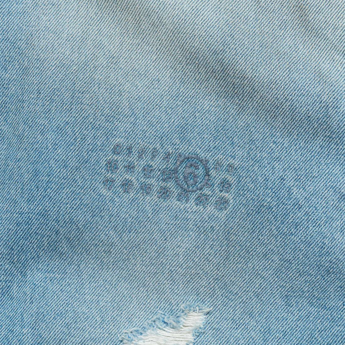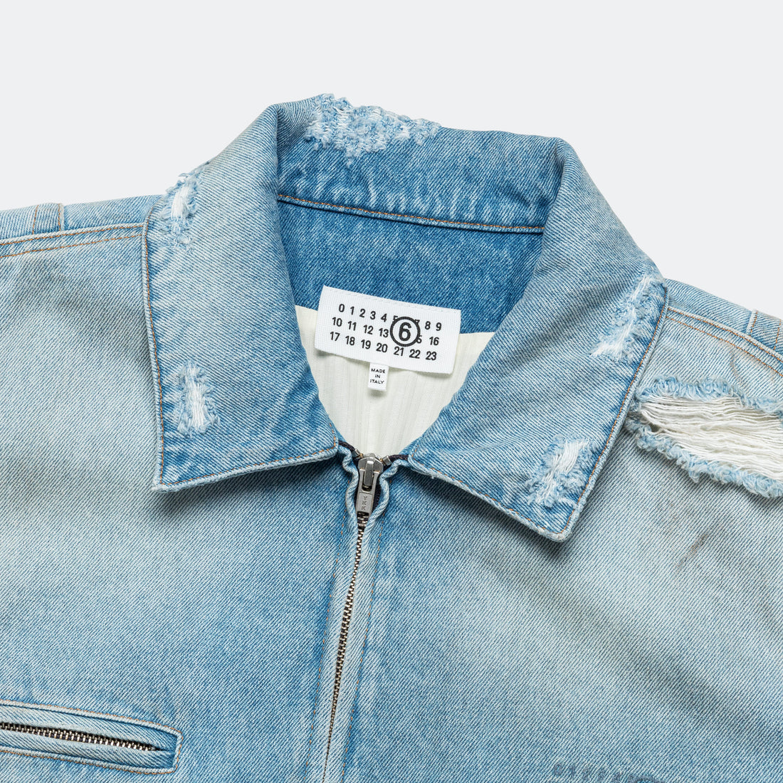 The Distressed Denim Sports Jacket is constructed in Italy from a premium cotton and is defined by intentional distressing, fading and marks. It features drop shoulders a spread collar and MM6's signature numeric branding at the chest.
