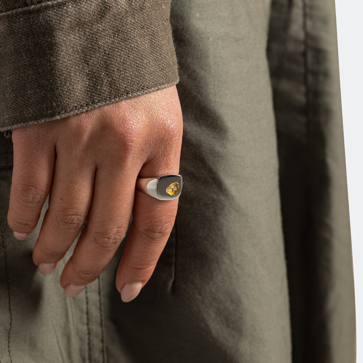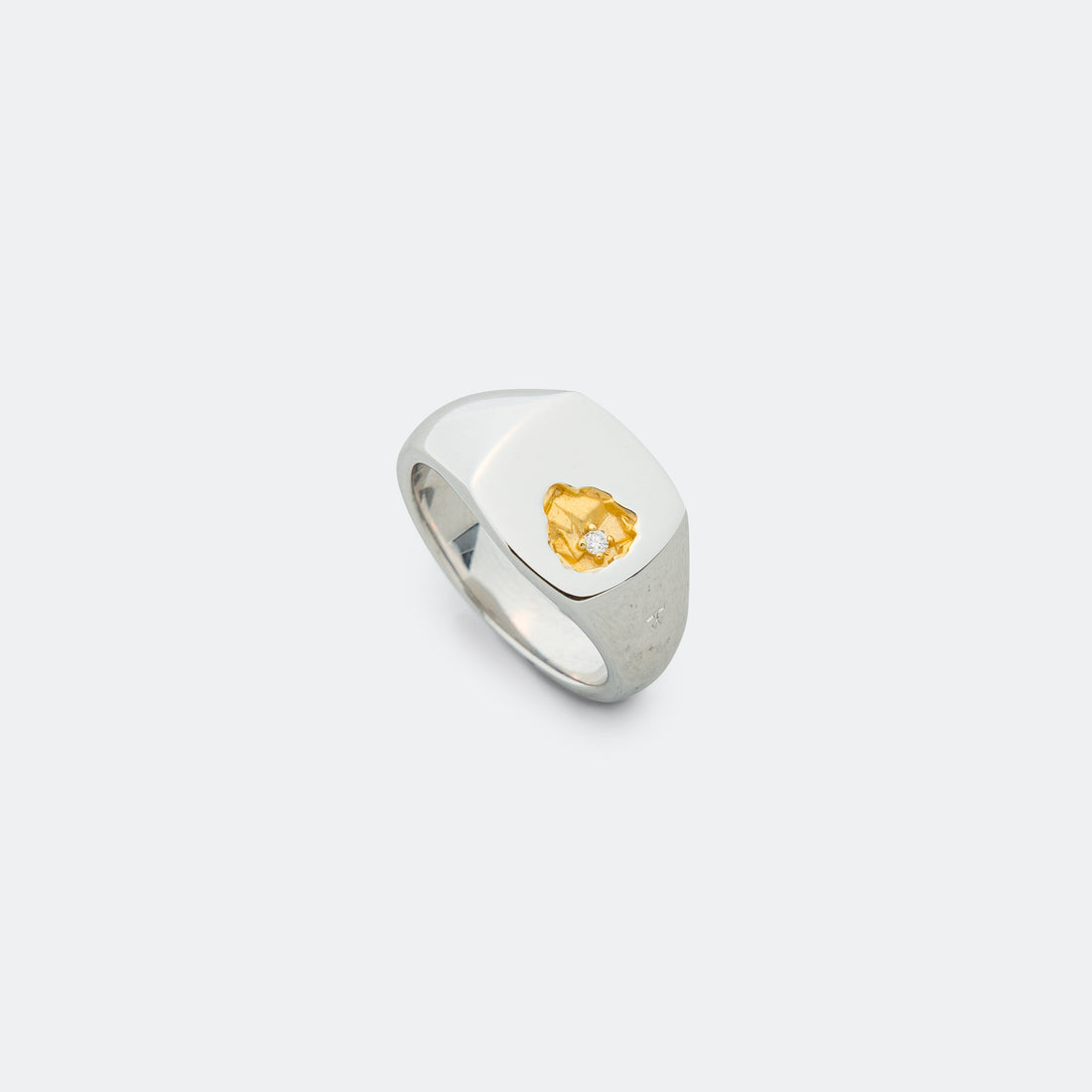 Part of the polished 925 silver ring is carved out, inspired by the rocky Norwegian coastline. The rough surface is plated with satin 14K gold to further accent the contrast – tucked within this erosion is a round brilliant-cut white diamond.
