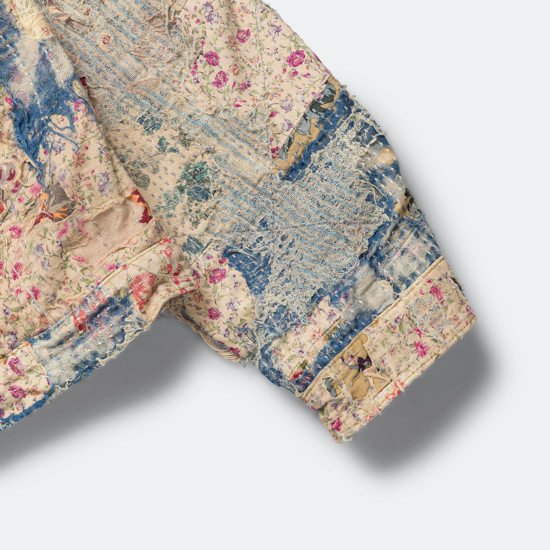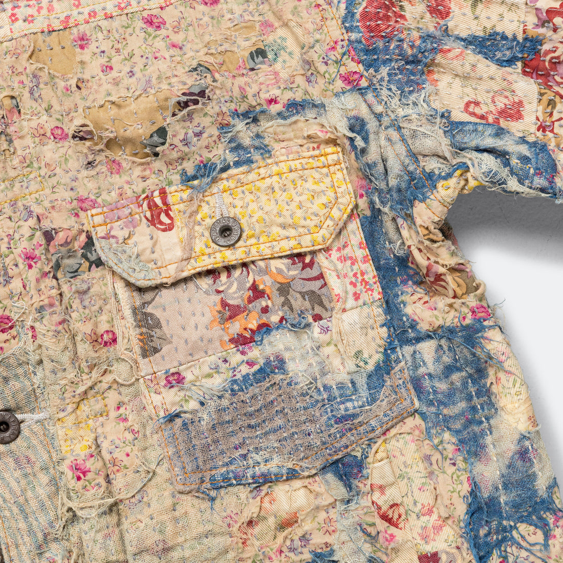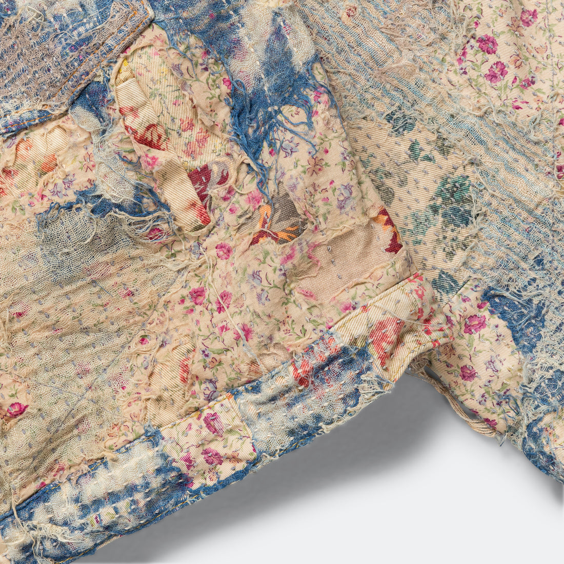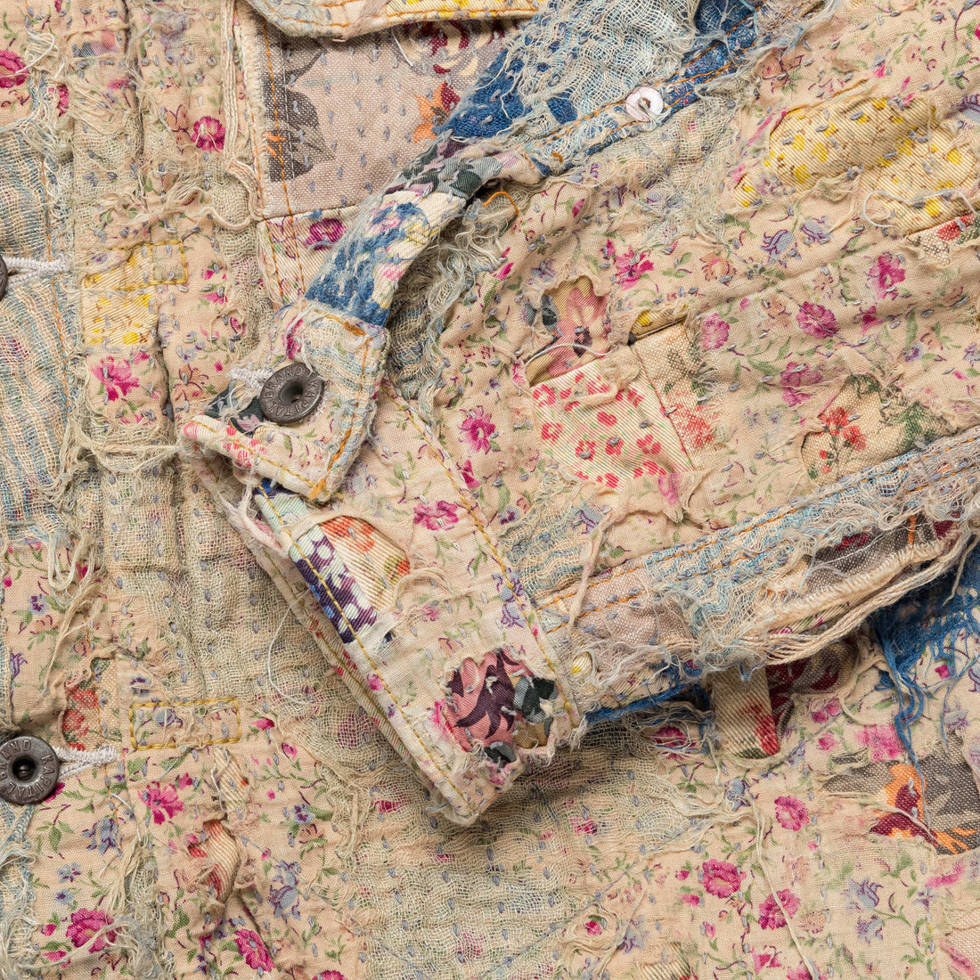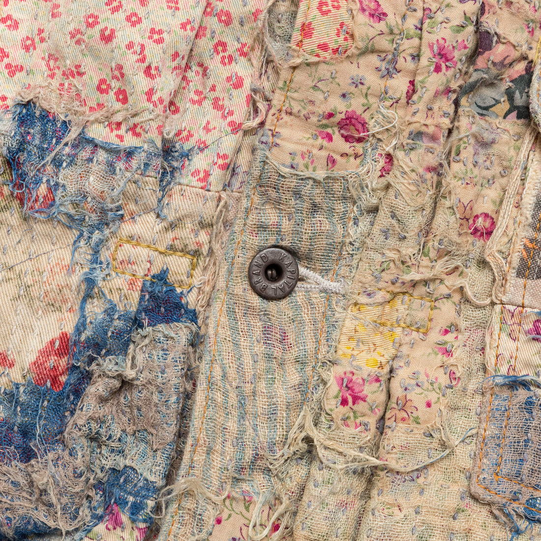 Distressing, repairing, patching and reinforcing denim, the level of detail within each garment is almost impossible to document in text or images. Sashiko embroidery criss-crosses the entire jacket, made with a host of different patterns and directions which hold together multiple patches and repairs. This technique has been employed by working class Japanese people for generations as a way of extending the life of treasured garments.