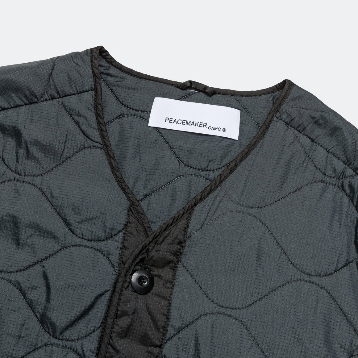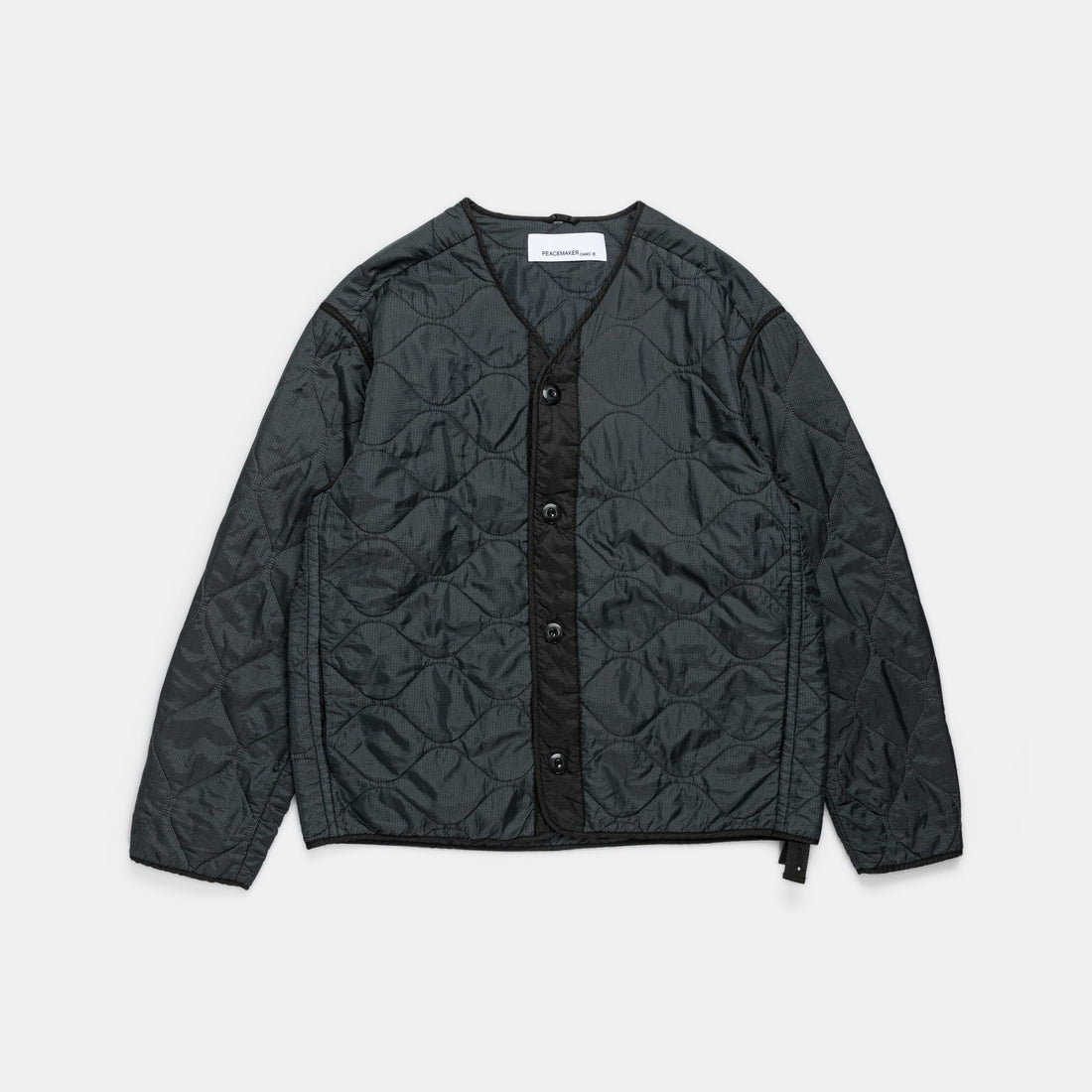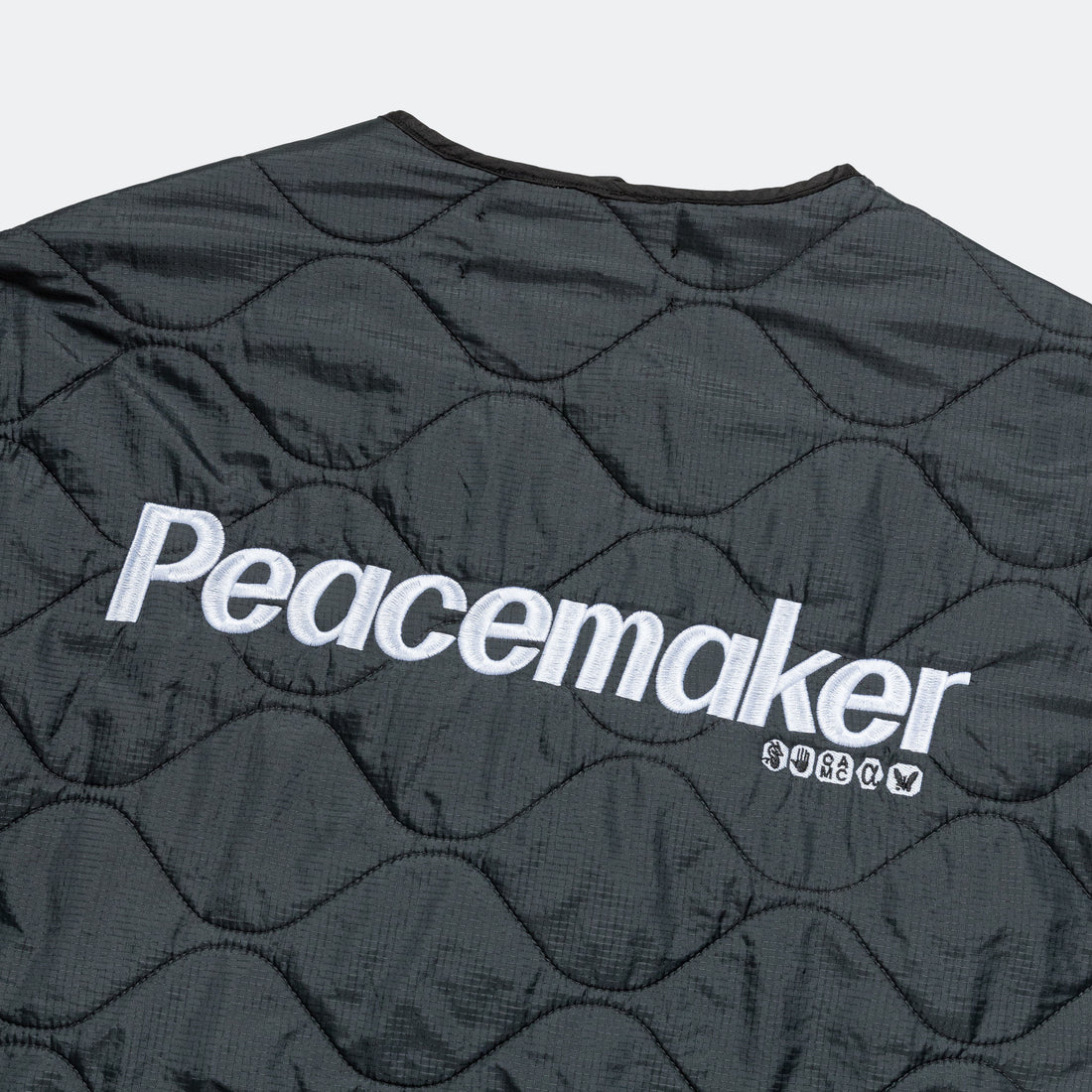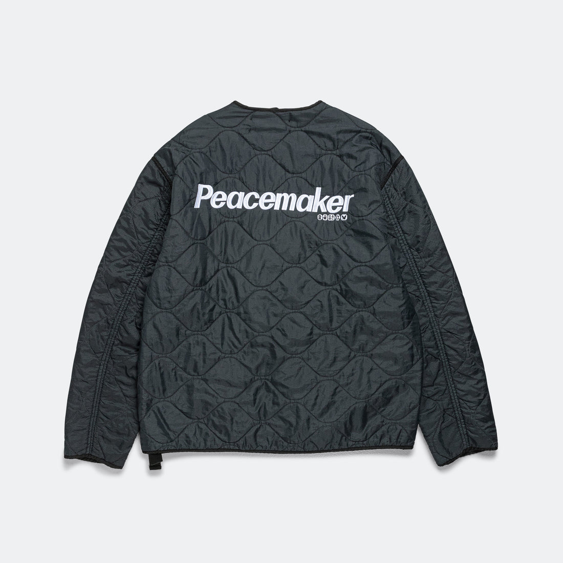 The jacket is from a smooth nylon ripstop fabric with a quilted construction. The brand make themselves known with an embroidered Peacemaker logo at the back and button tag at the hemline that's distinctive to the brand.