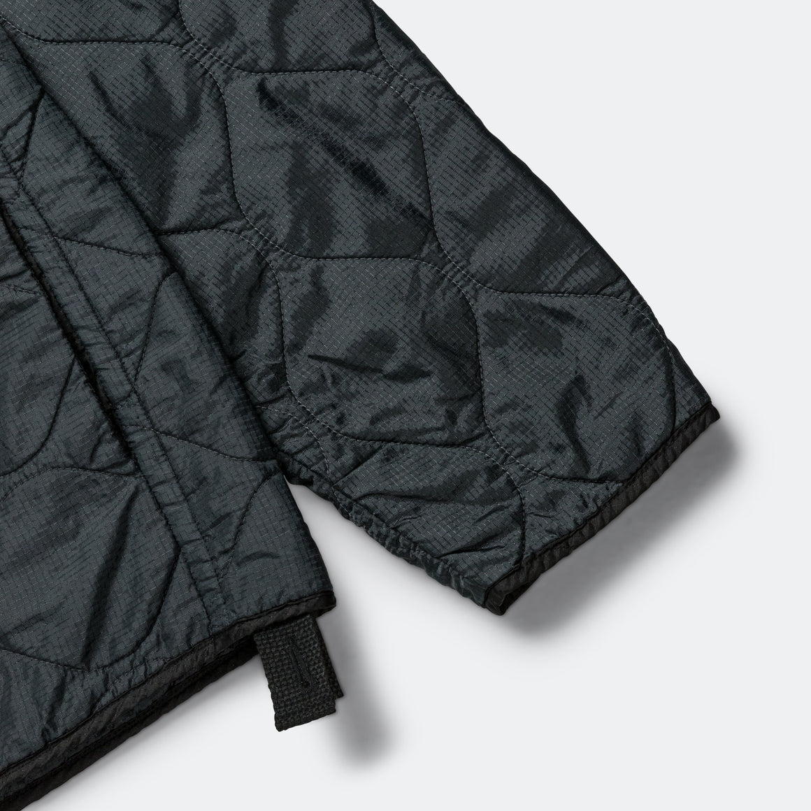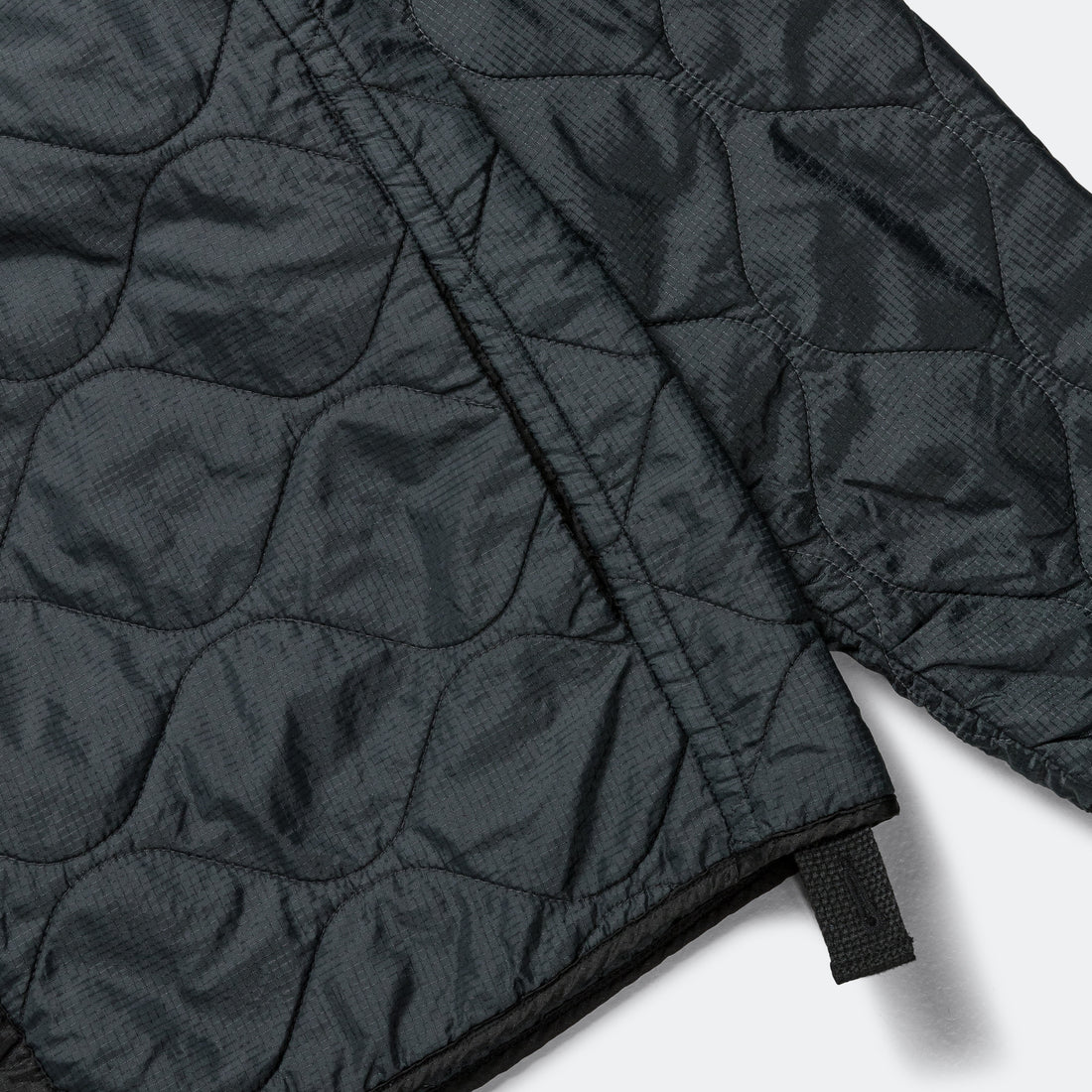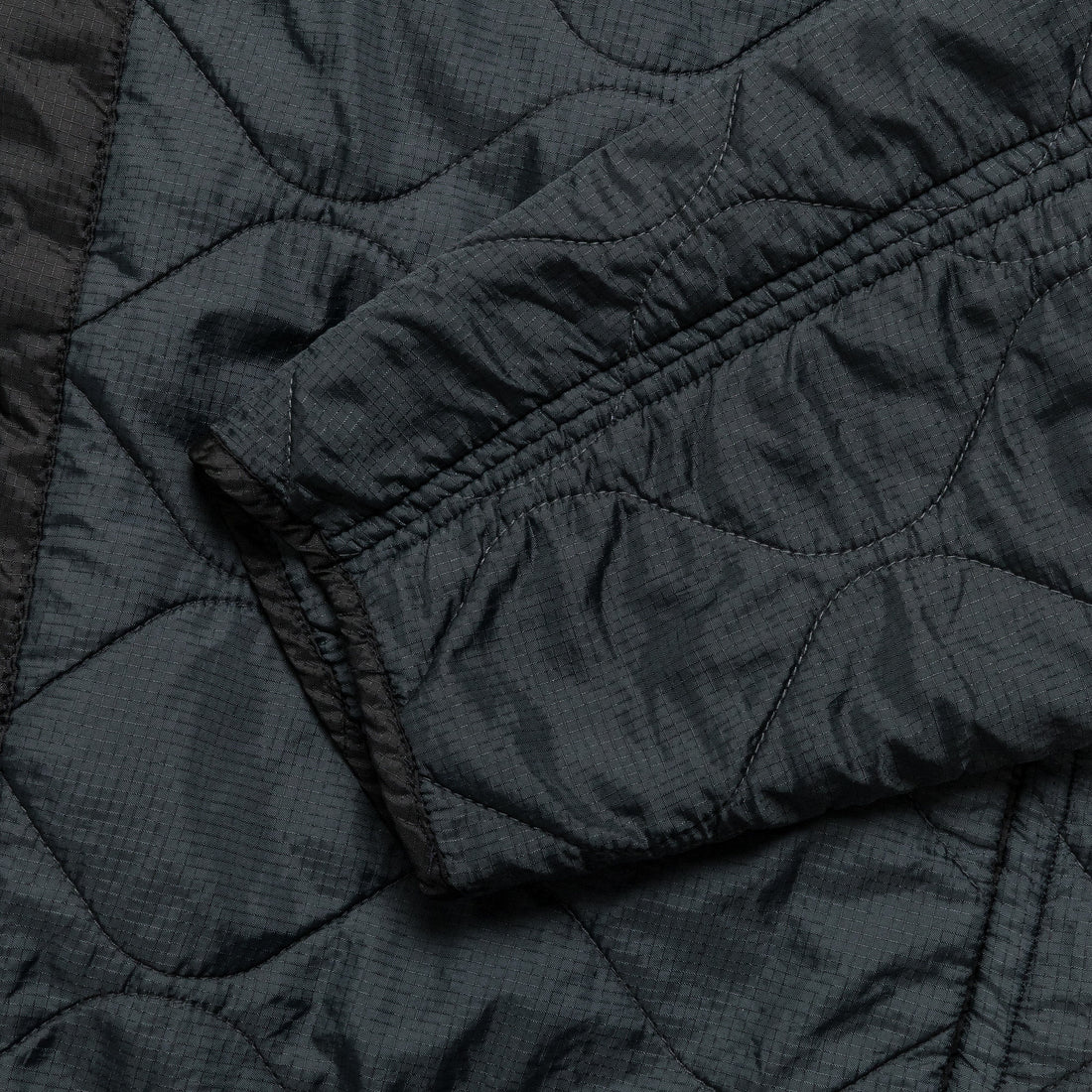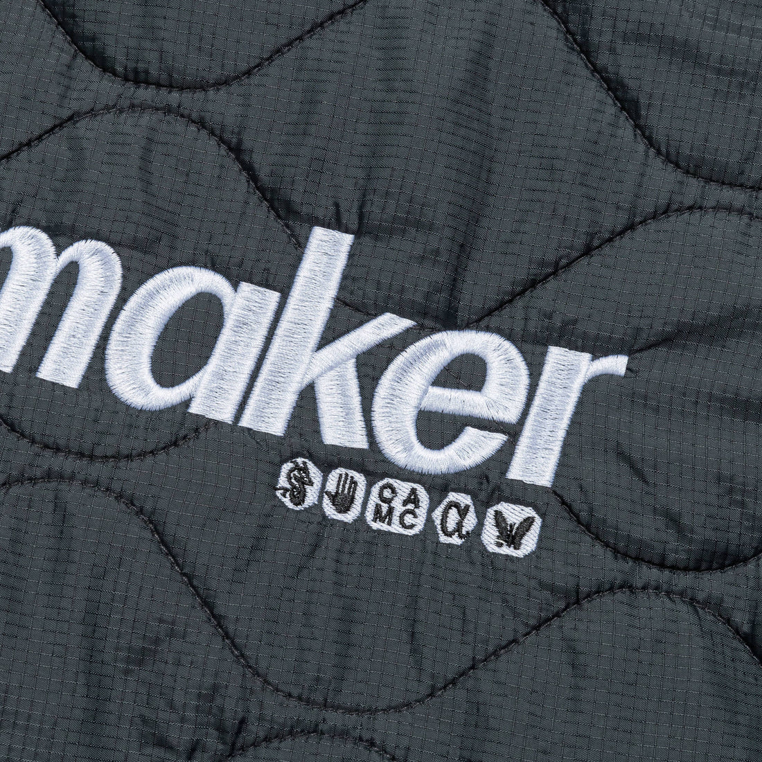 The jacket is from a smooth nylon ripstop fabric with a quilted construction. The brand make themselves known with an embroidered Peacemaker logo at the back and button tag at the hemline that's distinctive to the brand.