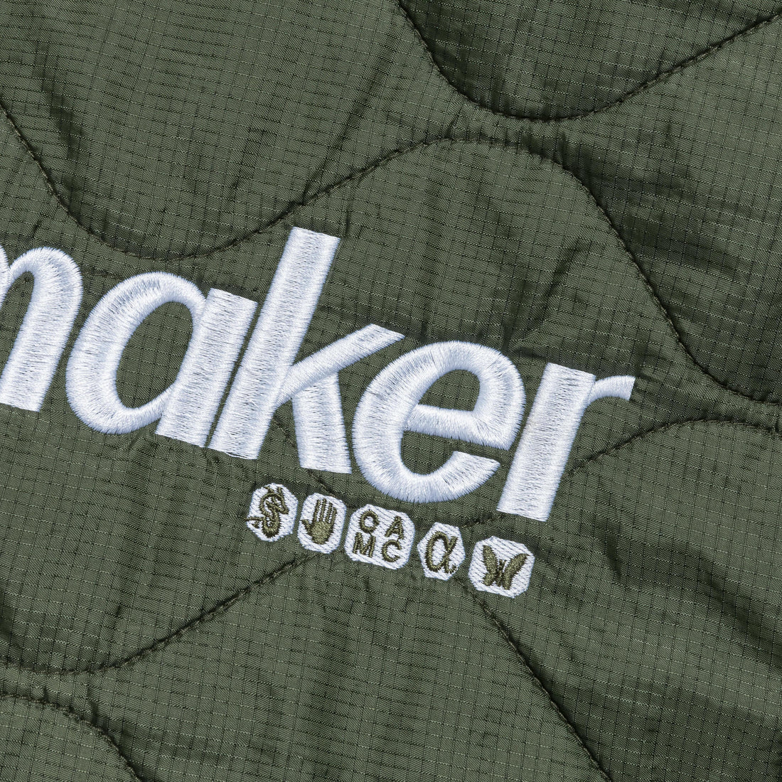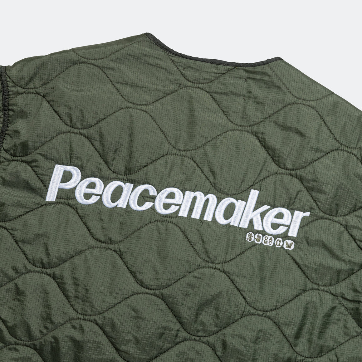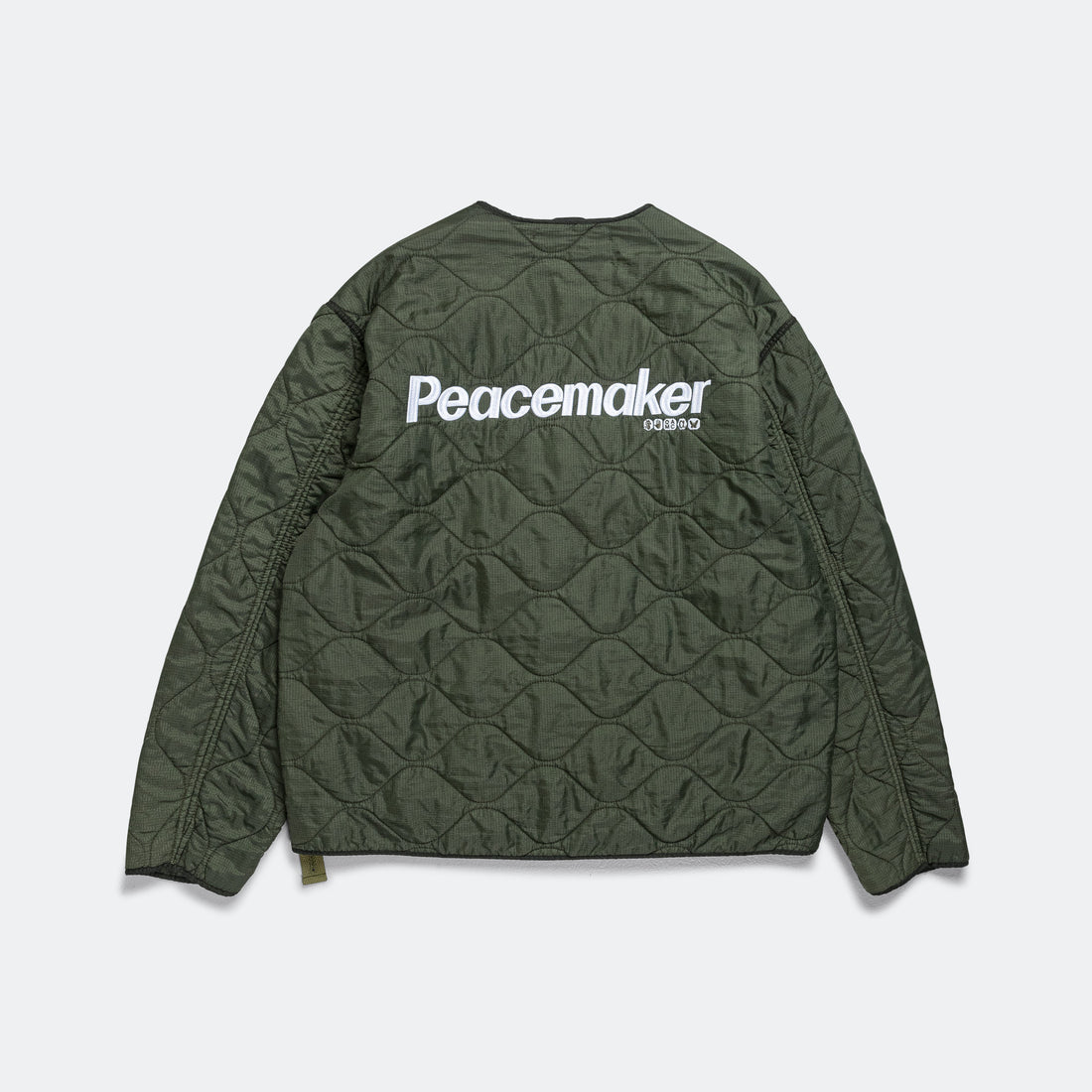 The jacket is from a smooth nylon ripstop fabric with a quilted construction. The brand make themselves known with an embroidered Peacemaker logo at the back and button tag at the hemline that's distinctive to the brand.