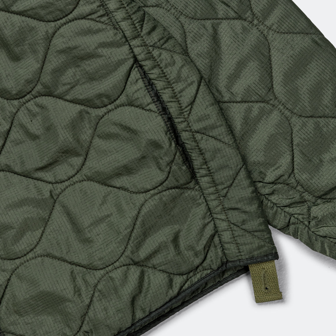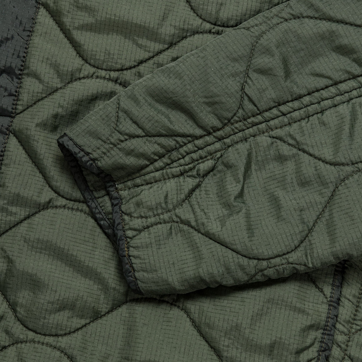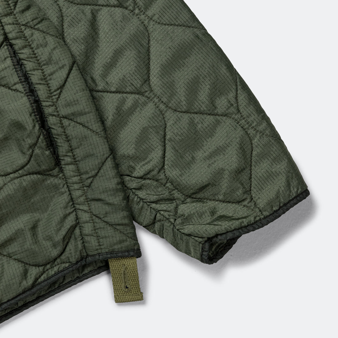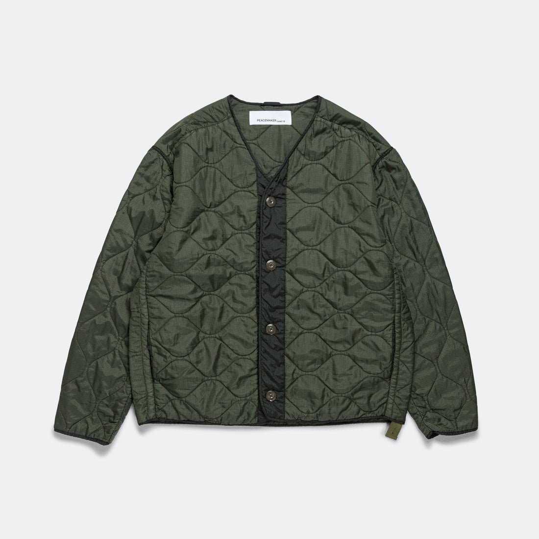 The jacket is from a smooth nylon ripstop fabric with a quilted construction. The brand make themselves known with an embroidered Peacemaker logo at the back and button tag at the hemline that's distinctive to the brand.