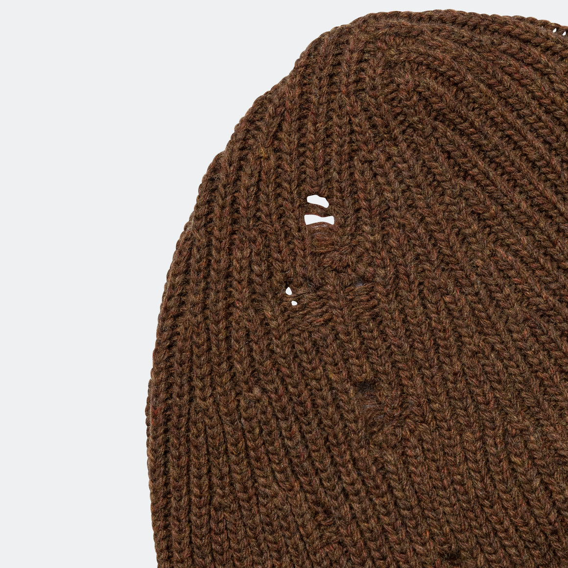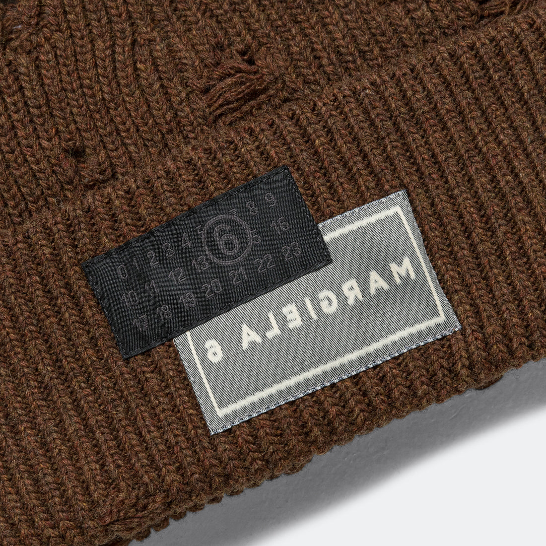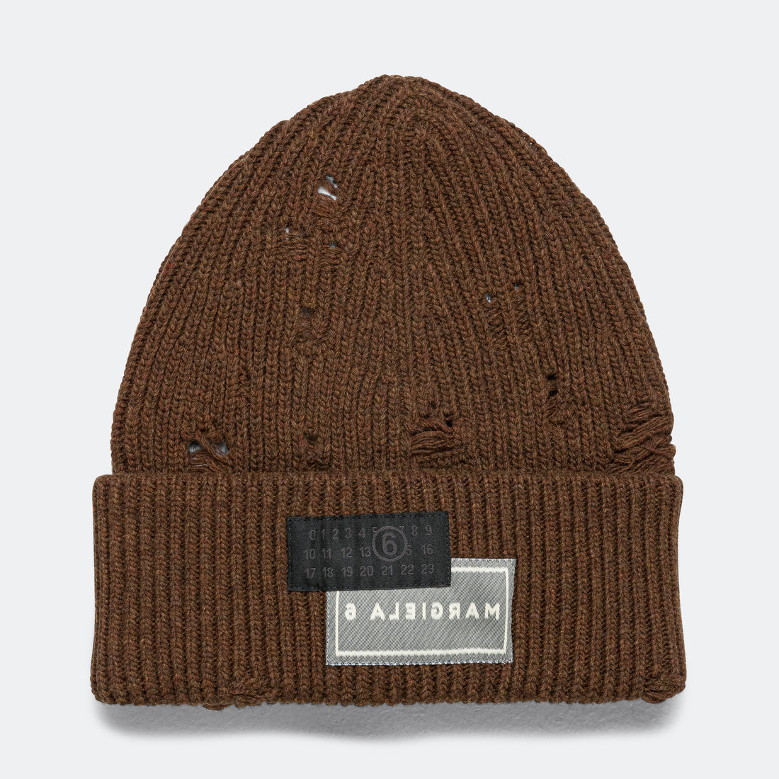 It speaks for itself really, but I guess this is my job so heres some words for you. It's crafted from a virgin wool blend with a cosy knitted construction that sits atop ones head seamlessly. It features light distressing throughout the piece and overlapping MM6 brand tags just to let them know.