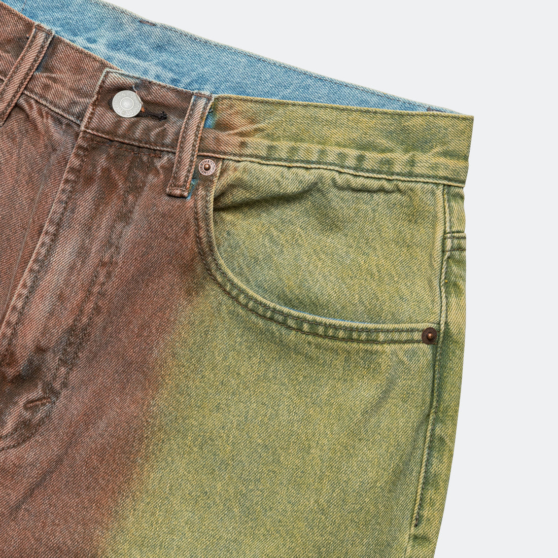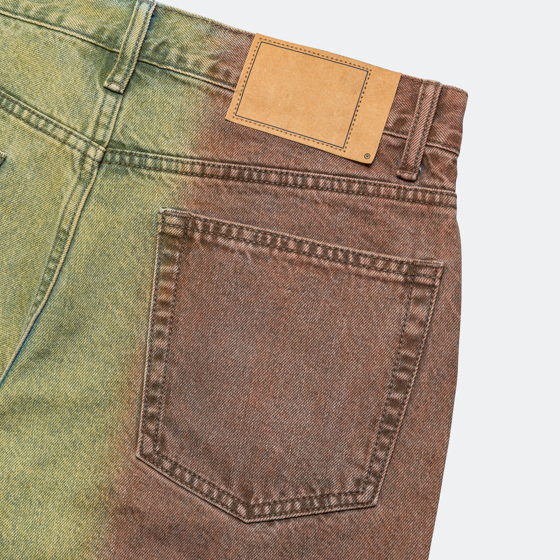 Made from 13oz cotton denim, these jeans are spray-dyed to achieve a Red, Yellow and Green colourway. They're a classic five-pocket design and are cut for a regular fit, which is probably the only thing regular about them.