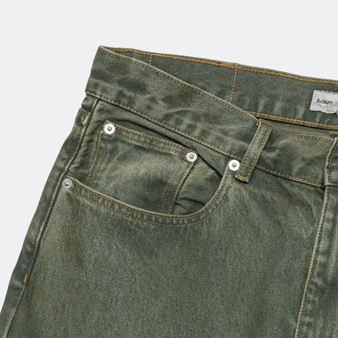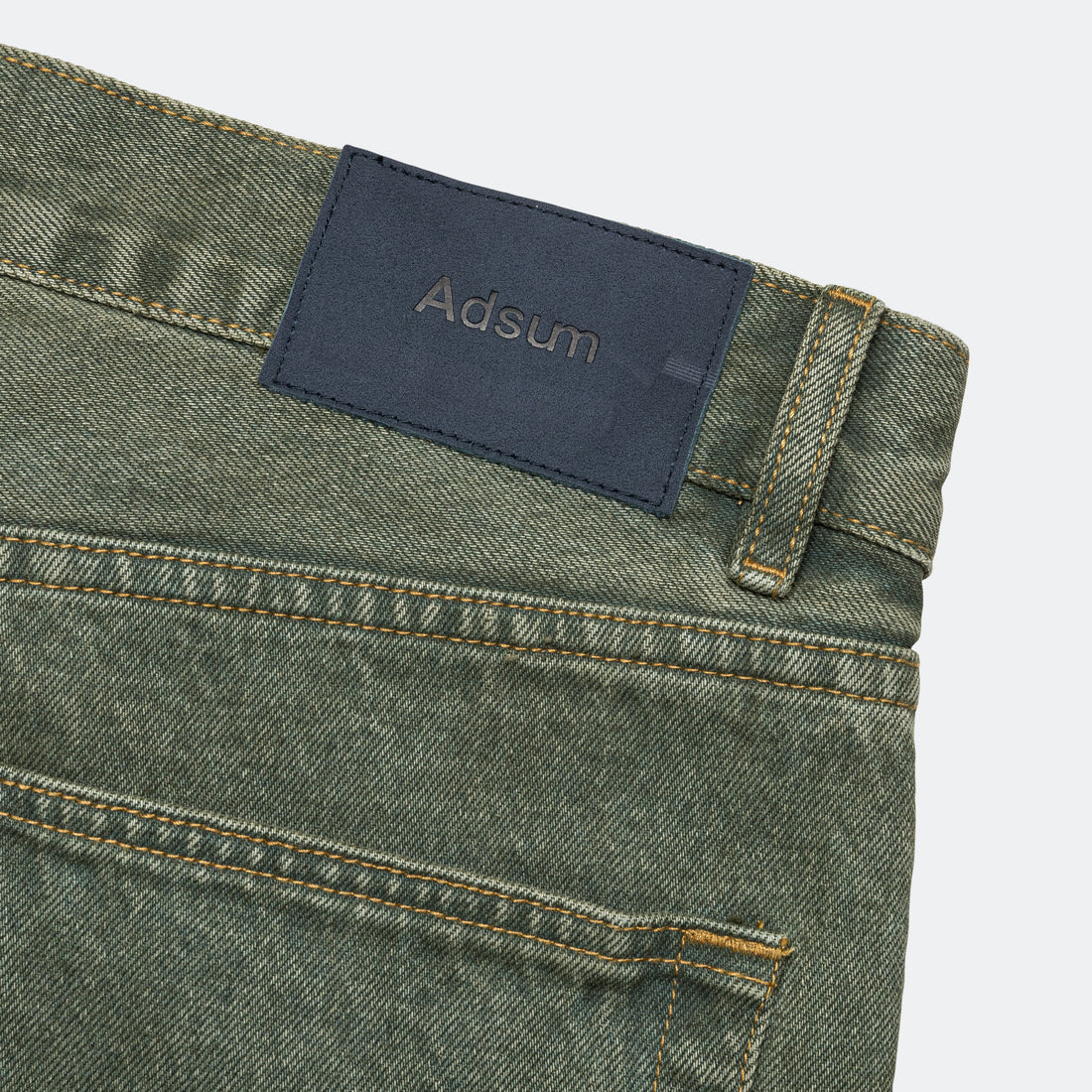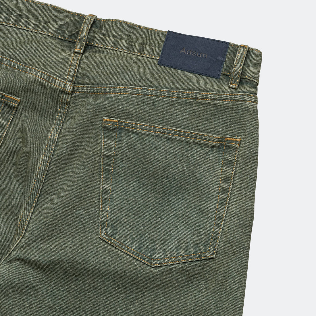 These get the typical Adsum treatment, using heavy thread tex chain stitching machines to do a whole garment overdye, achieving the desired wash. The process also gives them a soft feel out of the box, skipping the painful breaking-in process you'd normally need to persevere through with raw denim.