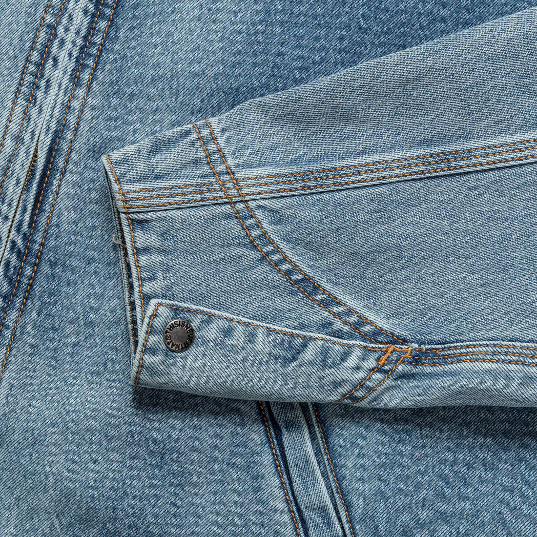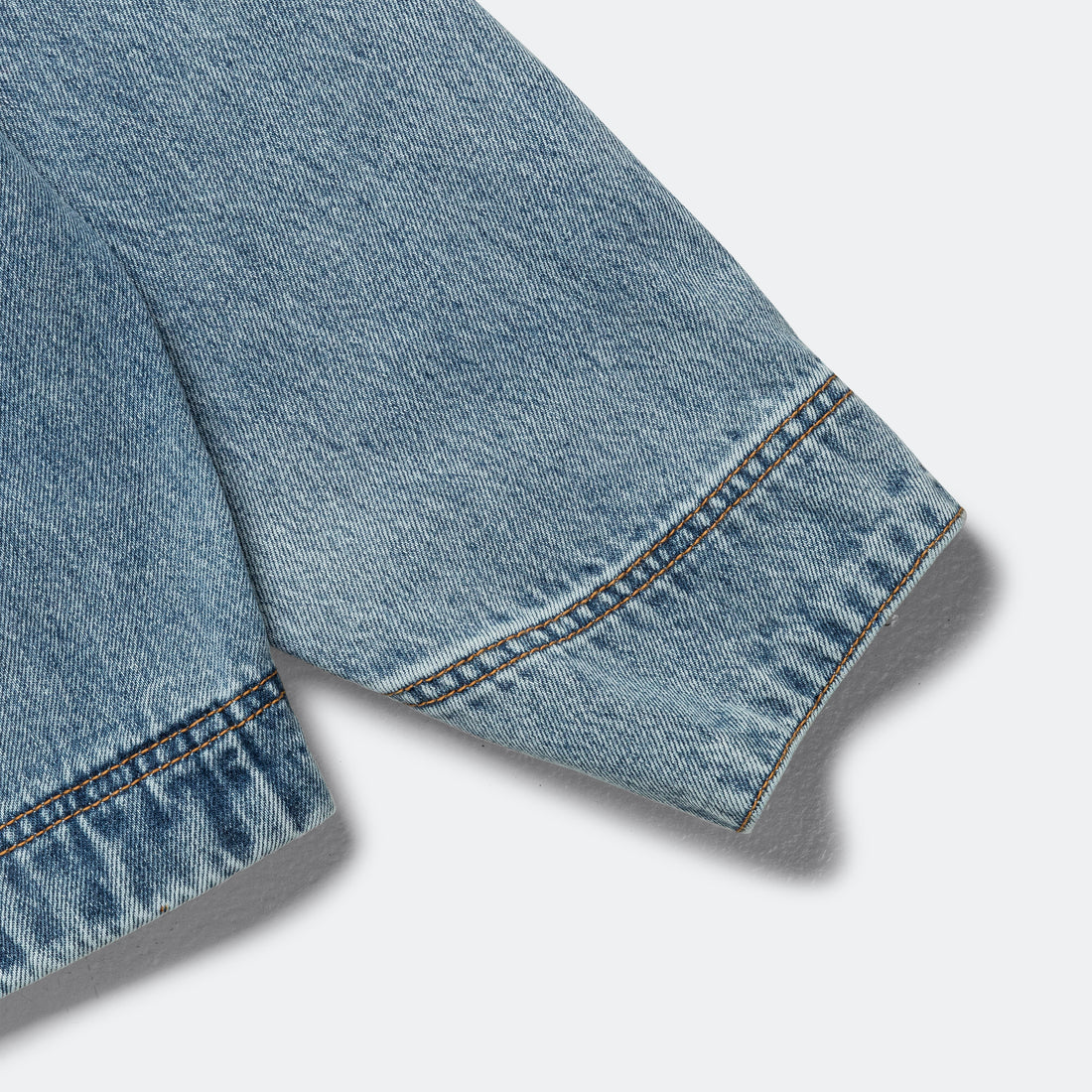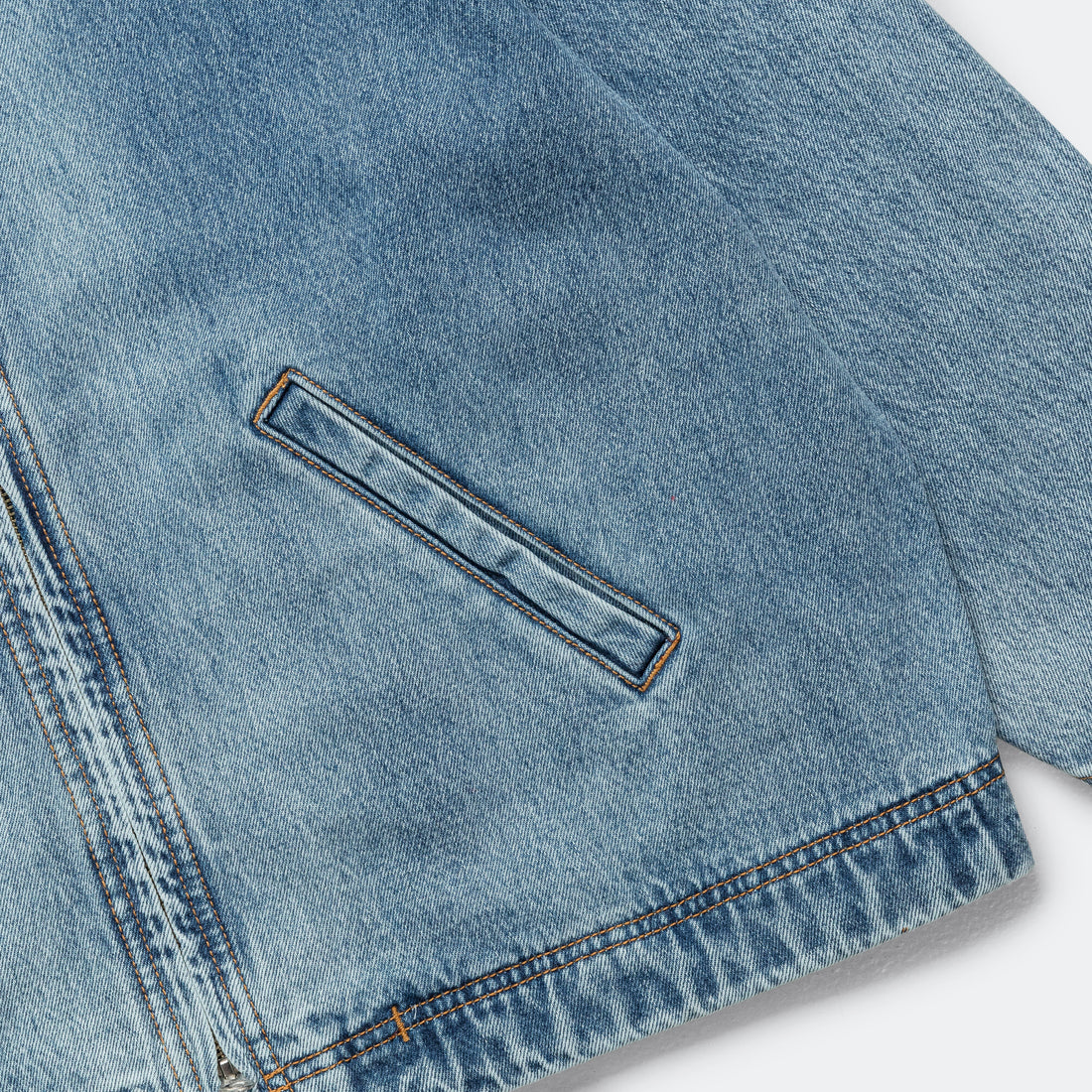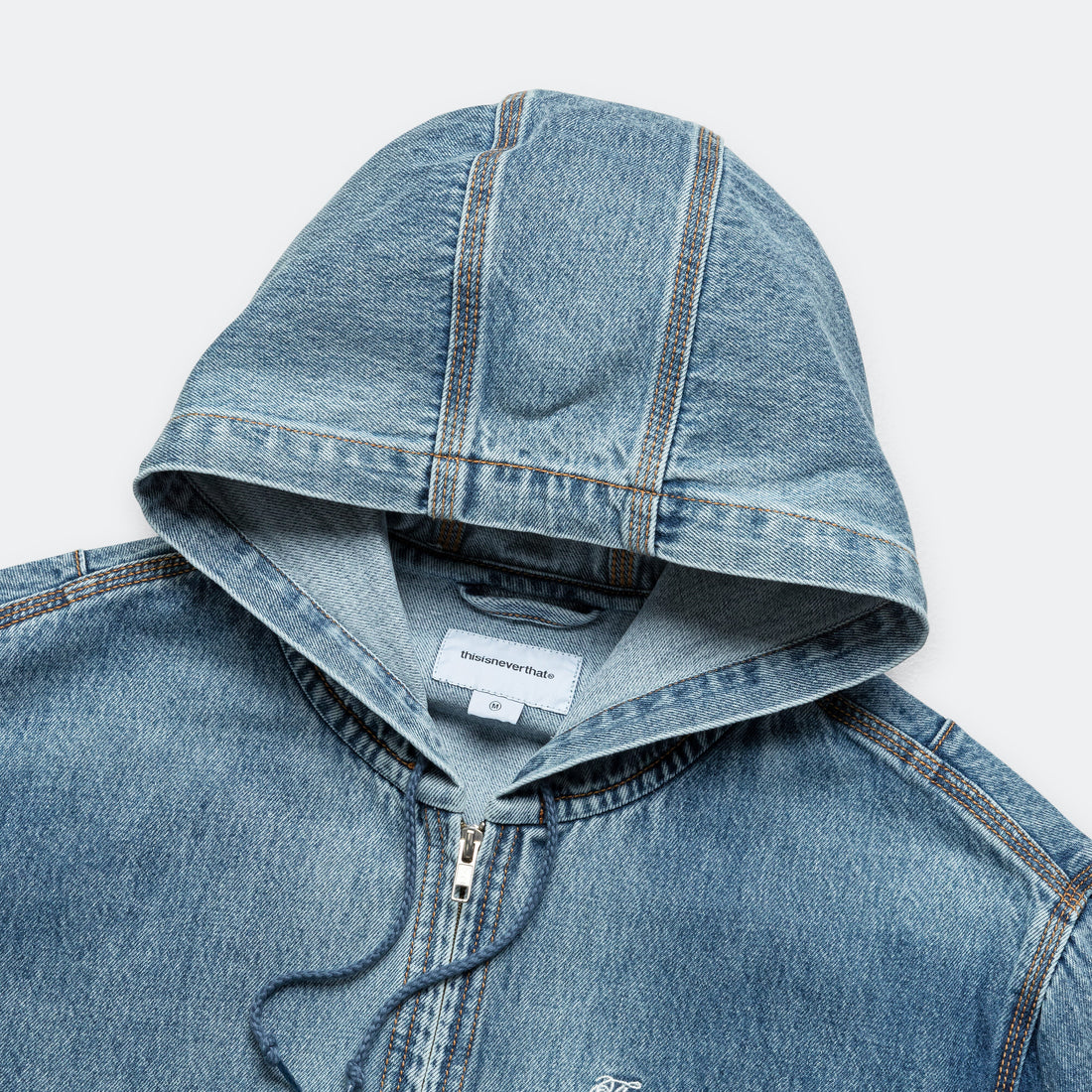The denim body creates a durable garment that can be easily layered over tees and shirts, with snap adjusters on the waist and cuffs holding everything together. Welt side pockets and a drawstring hood add a practical touch to the jacket while an embroidered chest logo adds a subtle decoration.